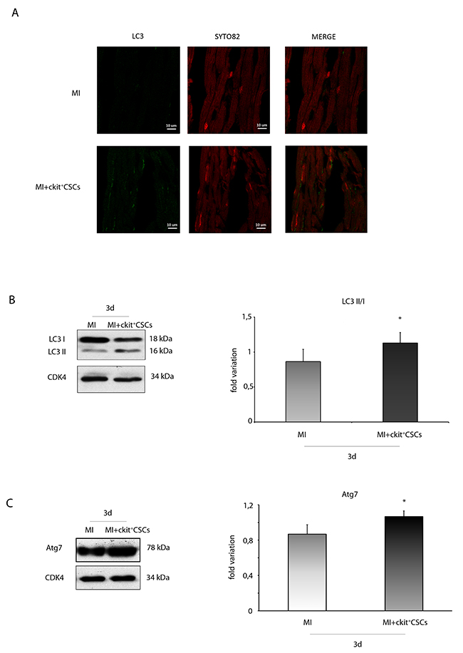 Since recent studies have indicated a protective role of the autophagic process in ischemic heart disease [30, 31], we tested whether reduced apoptotic rate in the peri-infarct region of transplanted hearts was associated to increased autophagy. We firstly performed an immunofluorescence for the ubiquitin-like modifier LC3 (LC3). Results revealed that, 3 days following MI, the ckit+CSC transplanted group exhibited an higher number of cardiomyocytes with LC3 punctate dots compared to the control group. To further confirm that autophagy was induced, we analyzed the expression of LC3 by WB analysis (Figure 11A). Results showed that, 3 days following MI, there was a significant increase in LC3 II formation in the border zone of ckit+CSC transplanted hearts compared to controls indicative of autophagosome formation. Further, the infarcted hearts were also characterized, following cell transplantation, by significant up-regulation of autophagy-related gene 7 (Atg7) protein level, another important protein for autophagosome formation (Figure 11B).