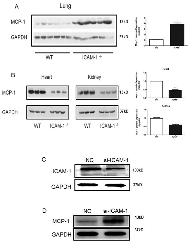 Figure 1: ICAM-1 deficiency or downregulation promotes MCP-1 expression in mouse lungs and macrophages. (A) Comparison of MCP-1 expression in WT or ICAM-1-/- mouse lungs by Western blot analysis. MCP-1 is elevated in ICAM-1-/- mouse lungs. (B) Comparison of MCP-1 expression in WT or ICAM-1-/- mouse heart and kidney. MCP-1 expression is relative decreased. (C) In RAW264.7 cells transfected with siRNA-ICAM-1, knockdown of ICAM-1 was measured with Western blot analysis. (D) In RAW264.7 transfected with siRNA-ICAM-1, MCP-1 expression is upregulated as measured with Western blot. (** p <0.01, *** p <0.001).