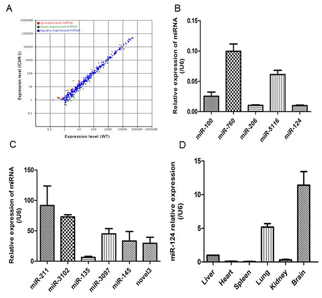 Figure 2: Different miRNA profiles of ICAM-1-/- mouse lungs and wild-type mouse lungs. (A) Differential expression of known mouse miRNAs in scatter plot. MiRNA profiles in wild-type mouse lungs are distinguished from that in ICAM-1-/- mouse lungs in Table 2. (B) and (C) Validation of selected microRNA sequence data by real-time qPCR. The relative amounts of each miRNA were normalized to U6 snRNA. (D) Analysis of miR-124 relative expression in the wild type mouse tissues by real-time qPCR. The data in graph were shown in mean ± SEM of 3 mice.