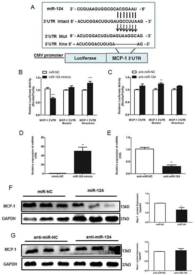 RAW264.7 cells were co-transfected with 50 ng psiCheck-2 with insertion of the wild-type, mutant, or knockout 3’UTR of MCP-1, along with miR-124 mimics, inhibitors or controls (50nmol/L). After 24h, the cells were collected for use in the Dual-Luciferase Reporter Assay (Promega). For miR-124 promoter analysis, RAW264.7 cells were co-transfected with 100 ng full length, truncated or mutant promoter firefly luciferase reporter constructs and 10 ng Renilla luciferase vector (pRL-TK). Luciferase activities were determined and were expressed as relative luciferase activity by normalizing firefly luciferase activity to Renilla luciferase activity.