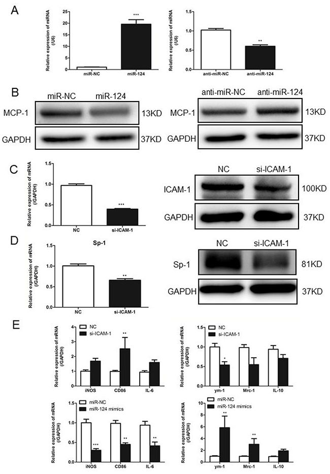 Our previous study shows that ICAM-1 expression negatively correlates with MCP-1expression in virus infected swine lungs [20]. In this report, we observed the overexpression of MCP-1 in ICAM-1 knockout mouse lungs and found that miR-124 mediates ICAM-1 regulated MCP-1 expression in macrophages, thereby modulates macrophage polarization. Our studies thus identify a previously unrecognized pathway of ICAM-1/miR-124/MCP-1 in regulate macrophage polarization.