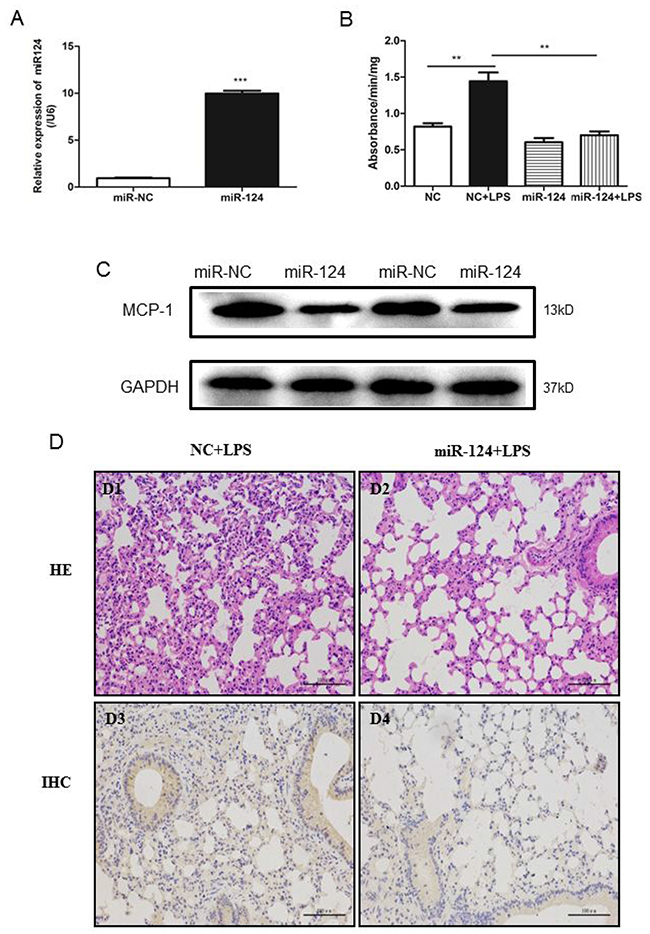 Formalin-fixed lung tissues were deparaffinized in xylene, rehydrated in graded alcohols, and stained with hematoxylin and eosin. The sections were evaluated for loss of normal lung architecture, erythrocyte exudation, and immune cell infiltration when treated with tail-vein LPS and miR-124 mimics. To further test the MCP-1 expression in lungs, immunohistochemistry experiments were conducted using a specific polyclonal anti-MCP-1 antibody. All sections were analyzed with a Nikon 80i microscope.