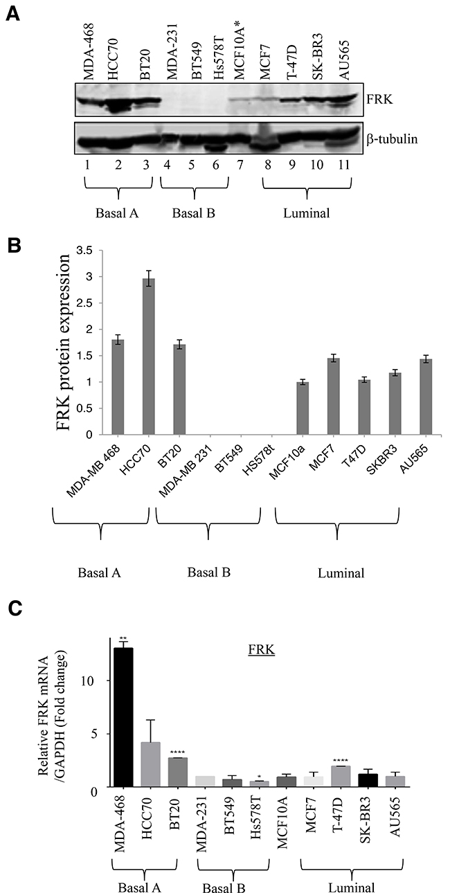 Figure 1: FRK expression in breast cancer cell lines. (A) The immortalized normal mammary epithelial cell line, MCF10A as well as the indicated breast cancer cell lines, corresponding to either the Basal A, Basal B or the luminal subtypes, were probed for FRK expression. β-tubulin was used as the loading control. (B) FRK protein expression was quantified using Image J software. Graph is representative image of the protein expression Figure 1A. (C) FRK mRNA levels in the same cell lines were quantitatively determined relative to MCF 10A with RT-PCR analyses using appropriate probes.