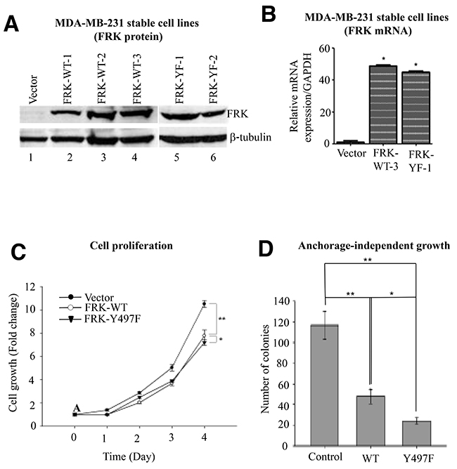 Figure 4: Effect of FRK expression on cell proliferation and anchorage-independent growth. (A) Vectors encoding wild-type FRK (FRK-WT) or FRK Y497F (FRK-YF) were retrovirally introduced into MDA-MB-231 cells and monoclonal populations derived and designated as indicated. The empty vector-transduced cell line served as control. FRK expression was determined in the stable cell lines by Western blotting analysis using antibodies against FRK. Beta-tubulin served as the loading control. (B) FRK mRNA expression in the indicated stable cell lines was determined via quantitative RT-PCR analyses. (C) Cell proliferation rates of the indicated FRK stable cell lines and the control cells expressing the empty vector were measured using the MTT assay. (D) Soft-agar assays were performed to examine anchorage-dependent growth in the control and FRK-expressing stable cell lines, FRK-WT and FRK Y497F. Statistical analyses for the replicates (n=3) of cell proliferation and soft-agar assays were performed using Graph-pad PRISM software (Ver. 5.0).