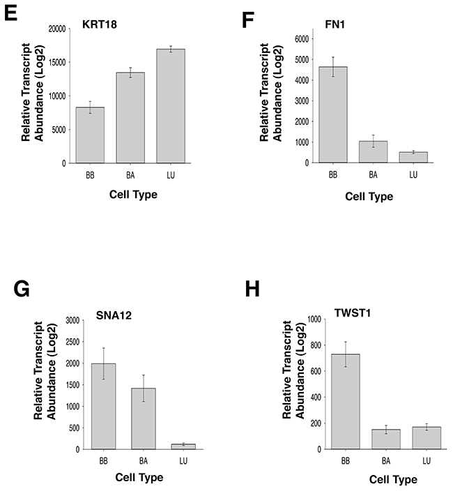 Figure 10: Gene expression profile of FRK and epithelial and mesenchymal markers in Basal A, Basal B, and luminal breast cancer cell lines. Logarithmized transcript abundances of (A) FRK, (B) Vimentin, VIM; (C) E-cadherin, CDH1; (D) N-cadherin, CDH2; (E) Keratin 18, KRT18; (F) Fibronectin, FN1, (G) Slug, SNAI2 and (H) TWIST1 were assessed in Basal A (BA), Basal B (BB) and Luminal (LU) breast cancer cell lines (N=56). Mean transcript levels of the indicated genes in breast cancer cell lines were mined from the GSE10021, GSE10843, GSE3156, GSE10890 and GSK’s cell line project (https://array.nci.nih.gov/caarray/project/woost-00041/) databases using the GENT software (http://medicalgenome.kribb.re.kr/GENT/reference.php). The data are presented as mean ± SEM. (p-value ≤ 0.05).