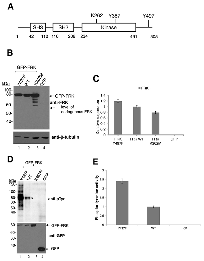 Src-family kinases (SFKs), as well as BRK, are activated by site-specific autophosphorylation on a tyrosine residue and inactivated by phosphorylation of a specific C-terminal tyrosine (Tyr-527 in Src, Tyr-497 in BRK and Tyr-504 in murine FRK) [13, 28, 32]. Mutation of this C-terminal tyrosine has been shown to constitutively activate the enzyme. Human FRK shares the same structural features as these tyrosine kinases and is therefore predicted to have the same mode of enzymatic regulation. The conserved domains include the SH3, the SH2, and the kinase domain. The auto-phosphorylation and ATP binding sites (Y387 and K262, respectively) of FRK are located on the kinase domain, while the Y497 residue lies in the C-terminal region extending from the kinase domain (Figure 3A). The specific enzymes that phosphorylate or dephosphorylate the C-terminal tyrosine of FRK are unknown. To investigate the cellular effect of human FRK activation, we first generated and assayed the activity of various GFP-tagged FRK variants. These variants included FRK-Y497F (activating), FRK K262M (disruption of ATP binding; kinase-defective) and FRK wild-type (WT). These constructs were transiently transfected into HEK 293 cells, which do not express FRK endogenously (Figure 3B). The expression levels of the transiently transfected FRK were comparable (Figure 3B and 3C). Although we observed smaller products produced by FRK-KM mutants, it is possible that the inactive FRK was being degraded. The level of tyrosine phosphorylation (a measure or indication of kinase activity) of the cellular proteins, following transfection with the constructs, were detected by immunoblotting with anti- phosphotyrosine antibody (pY20). Transfection with GFP-FRK-Y497F led to more enhanced phosphorylation of several cellular targets (Figure 3D), compared to FRK-WT (lane 2). Further, strong autophosphorylation of both FRK-Y497F and WT was also observed (indicated by asterisks, Figure 3D). The enhanced kinase activity induced by GFP-FRK-Y497F indicated that the C-terminal tyrosine 497 is essential in the regulation of FRK activity. As predicted, transfection with GFP-FRK-K262M (the catalytically inactive variant) did not result in the phosphorylation of any targets above the control level (Figure 3D lanes 3 and 4; Figure 3E). However, other mutations of FRK kinase domain increased FRK activity in breast cancer cells (Supplementary Figure 1), as previously shown in hepatocellular adenomas [6]. Our result indicates that FRK-Y497F is constitutively active. This mutant can, therefore, serve as a tool to study the cellular effects of fully activated FRK.