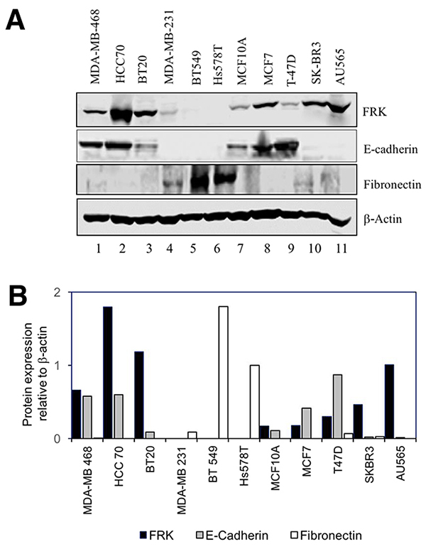 FRK has been shown to regulate cell proliferation of breast cancer and glioma cells, but its role in cell invasion in breast cancer has not been fully explored. It is also unclear whether the expression of FRK correlates with any breast cancer clinical parameter. In the present study, we found that FRK expression was typically low in the basal B breast cancer cells that exhibit mesenchymal characteristics and provide evidence that FRK regulates EMT in breast cancer cells.