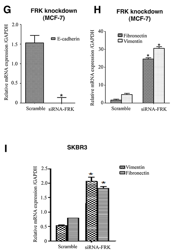 To directly determine the effect FRK on EMT in breast cancer cells, we examined the expression of epithelial and mesenchymal markers in the MDA-MB 231 cells stably expressing either FRK-WT or FRK-Y497F, as well as in FRK knockdown SKBR3 and MCF 7 cells via Real-time PCR and Western blotting analyses. Overexpression of both FRK-WT and Y497F in MDA-MB-231 cells significantly upregulated the levels of E-cadherin mRNA (Figure 9E) and downregulated several mesenchymal markers such as slug, fibronectin, and N-cadherin at the mRNA (Figure 9F). Although the presence of FRK-WT or Y497F dramatically reduced the levels of fibronectin and N-cadherin protein, no change in slug protein levels was observed (Supplementary Figure 8). We also observed a decrease in menschenmyal markers such as fibronectin in Hs578T breast cancer cell line with the transient overexpression of FRK (Supplementary Figure 9A and 9B). We also saw a minor increase in E-cadherin protein level in the presence of FRK-WT or Y497F (Supplementary Figure 8). The knockdown of FRK in MCF-7 resulted in a significant increase in vimentin and fibronectin mRNA levels, and a decrease in E-cadherin mRNA levels (Figure 9G and 9H). There was a corresponding increase in the protein levels of fibronectin and slug. However, there was no significant effect of FRK knockdown on E-cadherin protein levels (Supplementary Figure 8). The knockdown of FRK in SKBR3 also resulted in a significant increase in vimentin and fibronectin mRNA levels (Figure 9I), but its effect on E-cadherin mRNA and protein expression could not be analyzed because SKBR3 does not express E-cadherin [20]. Together, our data consistently showed that the overexpression of FRK increased the expression of E-cadherin mRNA and down-regulated the transcript levels of fibronectin, N-cadherin and slug, while knockdown of FRK in both MCF-7 and SKBR3 cells led to the upregulation of vimentin and fibronectin mRNA levels. Our findings, therefore, suggest that FRK inhibits EMT by stimulating the expression of the epithelial marker, E-cadherin and suppressing the expression mesenchymal proteins, especially vimentin and fibronectin.