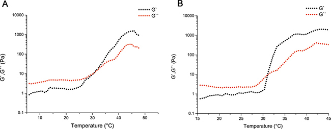 Figure 1: Thermal sensitivity of the injectable PDMP hydrogel composite. Thermal sensitivity of the PECE hydrogel composite (A) and the PDMP hydrogel composite (B) was examined by oscillatory rheological tests.