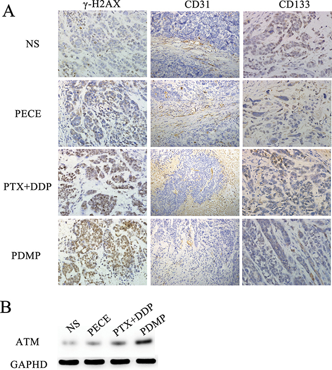 Figure 3: Immunohistochemical analysis of γ-H2AX, CD133 and CD31 and Western blot of ATM in xenografts from mice in various groups. (A) Immunohistochemical analysis of γ-H2AX, CD133 and CD31 in xenografts from mice in various groups; (B) Western blot of ATM in xenografts from mice in various groups; PTX, paclitaxel; DDP, cisplatin; PDMP, mixing MPEG-PCL/PTX micelles with DDP-loaded PECE hydrogel.