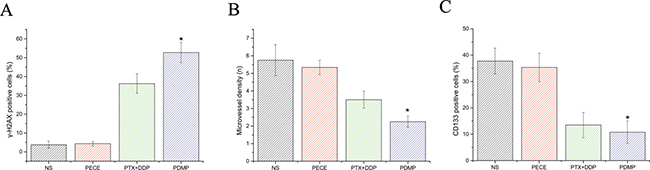 Figure 4: Quantitative analysis of γ-H2AX, CD133 and CD31 in xenografts from mice in various groups. (A) Quantitative analysis of γ-H2AX in xenografts from mice in various groups; (B) Quantitative analysis of CD31 in xenografts from mice in various groups; (C) Quantitative analysis of CD133 in xenografts from mice in various groups; *p < 0.05; PTX, paclitaxel; DDP, cisplatin; PDMP, mixed MPEG-PCL/PTX micelles with DDP-loaded PECE hydrogel.