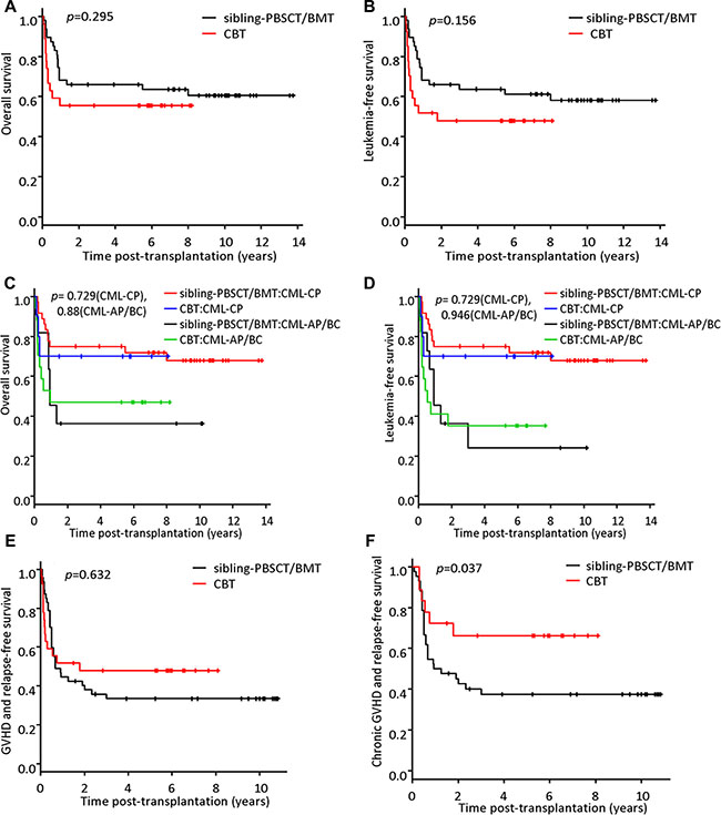 Figure 3: Probabilities of survival. The 5-year overall survival (OS) for the CBT and the sibling-PBSCT/BMT cohorts was 55.6% (95% CI, 35.2–71.8) and 66.0% (95% CI, 50.6–77.6) (p = 0.295) (A), and the 5-year leukemia-free survival (LFS) was 47.9% (95% CI, 28.3–65.0) and 63.7% (95% CI, 48.2–75.6) (p = 0.156) (B). For subgroup analysis of patients with CML-CP, the 5-year OS was 70.0% (95% CI, 32.9–89.2) and 75.0% (95% CI, 57.5–86.1) in the CBT and the sibling-PBSCT/BMT cohorts (p = 0.729) (C), and the 5-year LFS was the same as the 5-year OS for each cohort (3d). For patients with CML-AP or BC, the 5-year OS was 47.1% (95% CI, 23.0–68.0) and 36.4% (95% CI, 14.5–62.7) in the CBT and the sibling-PBSCT/BMT cohorts, respectively (p = 0.88) (C), and the 5-year LFS was 35.3% (95% CI, 14.5–57.0) and 24.2% (95% CI, 13.8–52.5), respectively (p = 0.946) (D). The 5-year probability of GVHD-free/relapse-free survival (GRFS) was 47.9% (95% CI, 28.3–65.0) and 33.4% (95% CI, 20.4–47.0) in the CBT and the sibling-PBSCT/BMT cohorts, respectively (p = 0.632) (E). However, among patients who survived more than 100 days after transplantation (n = 61), the 5-year probability of CRFS was 66.2% (95% CI, 39.6–83.2) in the CBT cohort, which was significantly higher than that in the sibling-PBSCT/BMT cohort [37.4% (95% CI, 23.0–51.8)] (p = 0.037) (F).