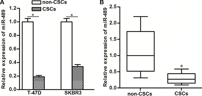 Figure 2: Expression of miR-489 was decreased in BCSCs. (A) QRT-PCR assays were performed to detect the relative expression of miR-489 in T-47D and SKBR3 CSCs and non-CSCs. *P < 0.05. (B) Breast cancer patients’ tissues (n = 30) were digested by collagenase type III. CSCs and non-CSCs in cell suspension were separated flow cytometry. Subsequently, relative expression of miR-489 in these CSCs and non-CSCs was detected by qRT-PCR analysis. *P < 0.05.