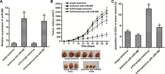 Figure 4: Overexpression of miR-489 enhanced the anti-tumor effect of 5-FU in vivo. (A) T-47D cells were infected with lentivirus with miR-489 and subcutaneously injected into BALB/c nude mice (8 mice for each group). Expression of miR-489 in lentivirus-infected tumors was detected by using qRT-PCR analysis. *P < 0.05 vs. empty lentivirus group, #P < 0.05 vs. 5-FU + empty lentivirus group. (B) Tumor growth in nude mice was inhibited by co-treatment with miR-489 and 5-FU (5 mg/kg 5-FU every three days) . (C) 5-FU-induced enrichment of CSCs was suppressed by miR-489 overexpression in tumors. *P < 0.05 vs. empty lentivirus group, #P < 0.05 vs. 5-FU + empty lentivirus group.