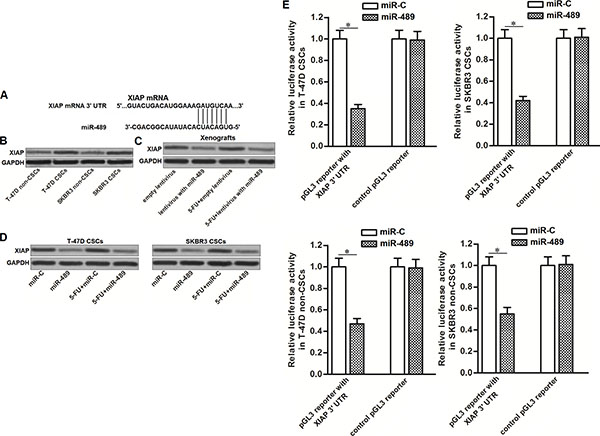 Figure 5: MiR-489 targeted XIAP in BCSCs. (A) Putative binding site of miR-489 in the XIAP 3’-UTR predicted by online bioinformatics database of TargetScan. (B) Upregulation of XIAP in T-47D and SKBR3 CSCs compared to their non-CSCs. (C) Overexpression of miR-489 in breast cancer cells decreased the expression of XIAP in vivo. (D) Overexpression of miR-489 in breast cancer cells decreased the expression of XIAP in vitro. (E) Transfection with miR-489 decreased the luciferase activities of the pGL3 reporter with XIAP 3’-UTR. *P < 0.05.