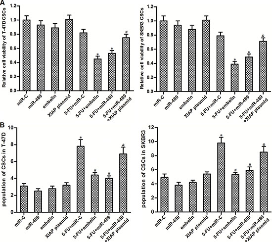 Figure 6: MiR-489 decreased the expression of XIAP to sensitize BCSCs to 5-FU treatment. (A) After transfection with miR-489, miR-C and XIAP plasmid, T-47D and SKBR3 CSCs were treated with 5-FU (5 μM) and embelin (10 μM) followed by detecting the cell viability through MTT assays. *P < 0.05 vs. 5-FU + miR-C group, #P<0.05 vs. 5-FU + miR-489 group. (B) Unsorted T-47D and SKBR3 cells were transfected with miR-489, miR-C and XIAP plasmid followed by treating with 5-FU (5 μM) and embelin (10 μM). Population of CSCs was detected by using flow cytometry. *P < 0.05 vs. miR-C group, #P<0.05 vs. 5-FU + miR-C group, &P < 0.05 vs. 5-FU + miR-489 group.