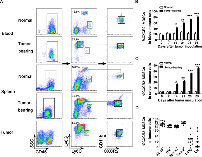 Figure 1: CXCR2+ MDSCs are predominately expanded and recruited during breast cancer progression. (A) Flow cytometric analysis of single cells isolated from peripheral blood, spleens and tumor tissues from tumor-bearing mice as well as normal mice on day 28 after tumor inoculation. CD45, Ly6G, Ly6C, CD11b and CXCR2 were analyzed. Compared the expression of Ly6G and Ly6C in Ly6G+Ly6C+ cells derived from normal mice, the phenotype of predominately expanded subset in tumor-bearing mice is Ly6GmiLy6Clo. Ly6GloLy6Chi subset was circled in green rectangle, Ly6GhiLy6Cmi subset was in orange rectangle, and Ly6GmiLy6Clo subset was in red rectangle. Ly6GmiLy6CloCD11b+CXCR2+ subset was defined as CXCR2+ MDSCs. One representative image of 6 mice was shown. Percentage of CXCR2+ MDSCs in peripheral blood (B) and spleens (C) derived from normal mice or 4T1 tumor-bearing mice on day 0, 7, 14, 21, 28, and 35 after tumor inoculation was shown. *P < 0.05, **P < 0.01, ***P < 0.001. (D) Percentage of CXCR2+ MDSCs in peripheral blood, bone marrow (BM), spleens, tumor tissues, lungs and lymph nodes (LN) derived from 4T1 tumor-bearing mice on day 35 was shown.