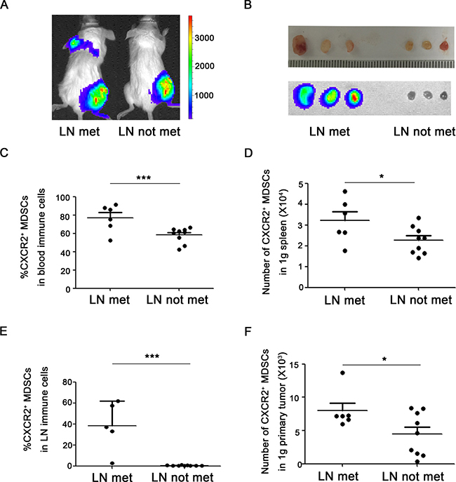 Figure 2: CXCR2+ MDSCs are relevant to breast cancer lymph node metastasis. (A) Representative image of mice with or without axillary lymph node metastasis in 4T1 tumor-bearing mice using in vivo bioluminescence imaging. (B) Metastatic axillary lymph nodes were confirmed by bioluminescence imaging. (C) Percentage of CXCR2+ MDSCs in immune cells of peripheral blood from 4T1 tumor-bearing mice with or without axillary lymph node metastasis. (D) Number of CXCR2+ MDSCs in 1g spleen of 4T1 tumor-bearing mice with or without axillary lymph node metastasis. (E) Percentage of CXCR2+ MDSCs in immune cells of axillary lymph nodes from 4T1 tumor-bearing mice with or without axillary lymph node metastasis. (F) Number of CXCR2+ MDSCs in 1g primary tumor of 4T1 tumor-bearing mice with or without axillary lymph node metastasis. *P < 0.05,***P < 0.001. Data was presented by mean ± sem.