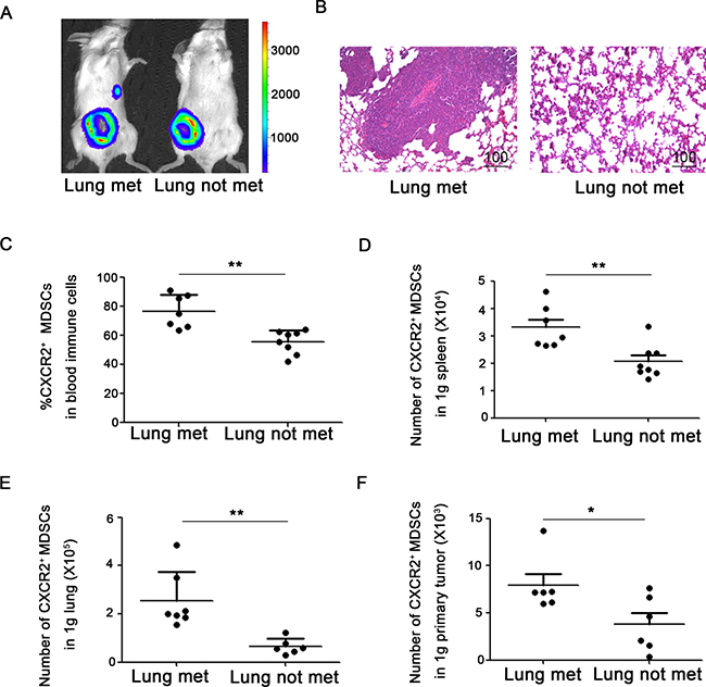 Figure 3: CXCR2+ MDSCs are involved in breast cancer lung metastasis. (A) Representative image of mice with or without lung metastasis in 4T1 tumor-bearing mice using in vivo bioluminescence imaging. (B) Metastatic lung was confirmed by hematoxylin & eosin staining. (C) Percentage of CXCR2+ MDSCs in immune cells of peripheral blood from 4T1 tumor-bearing mice with or without lung metastasis. (D) Number of CXCR2+ MDSCs in 1g spleen of 4T1 tumor-bearing mice with or without lung metastasis. (E) Number of CXCR2+ MDSCs in 1g lung of mice 4T1 tumor-bearing with or without lung metastasis. (F) Number of CXCR2+ MDSCs in 1g primary tumor of 4T1 tumor-bearing mice with or without lung metastasis. *P < 0.05, **P < 0.01. Data was presented by mean ± sem.