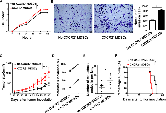 Figure 4: CXCR2+ MDSCs promote breast cancer progression. (A) Proliferation of 4T1 cells co-cultured with or without CXCR2+ MDSCs (4T1:CXCR2+ MDSCs 1:5) was supervised by Real-Time Cell Analyzing (RTCA) methods. (B) Invasion ability of 4T1 cells which interplayed with or without CXCR2+ MDSCs (4T1:CXCR2+ MDSCs 1:5) was recorded. (C) Tumor size of 4T1 tumor-bearing mice which was injected with or without CXCR2+ MDSCs (4T1:CXCR2+MDSC 1:50) was measured by vernier caliper and recorded. (D) Metastasis incidence- either lung or lymph node metastasis- of three experiments of 4T1 tumor-bearing mice with or without CXCR2+ MDSCs inoculation (4T1:CXCR2+MDSC 1:50). Each line connected metastatic data from two groups of respective experiment and there were at least 6 mice per group. (E) Number of metastatic nodes in lungs from 4T1 with or without CXCR2+ MDSCs inoculation mice (4T1:CXCR2+MDSC 1:50). (F) Representative survival curve of 4T1 with or without CXCR2+ MDSCs inoculation mice (4T1:CXCR2+MDSC 1:50). There were 5 and 6 mice in 4T1 with or without CXCR2+ MDSCs inoculation group respectively. *P < 0.05, **P < 0.01. Data was presented by mean ± sem. Every experiment was replicated at least three times.