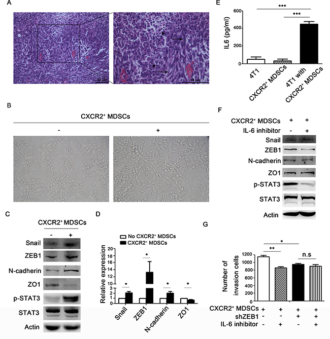 Figure 5: CXCR2+ MDSCs induce breast cancer cells EMT. (A) Representative image of metastatic axillary lymph node by hematoxylin & eosin (HE) staining. Black arrows pointed to spindle tumor cells. Arrow head pointed to granulocytes. (B–G) 4T1 cells were co-cultured with or without CXCR2+ MDSCs (4T1:CXCR2+ MDSCs 1:5), image of the morphology of 4T1 cells in light field (B). 4T1 cells were co-cultured with or without CXCR2+ MDSCs for 42h, and protein expression of 4T1 cells was detected by western-blot (C). mRNA expression of 4T1 cells co-cultured with or without CXCR2+ MDSCs was detected by quantitative PCR (D). IL-6 concentration in the supernatant of 4T1 culture medium alone, CXCR2+ MDSCs culture medium alone and 4T1 and CXCR2+ MDSCs co-culture medium was detected by ELISA (E). Protein expression of 4T1 cells treated with or without IL-6 inhibitor when co-cultured with CXCR2+ MDSCs, was measured by western-blot (F). Invasion ability of 4T1 cells and 4T1-shZEB1 cells, treated with or without IL-6 inhibitor when co-cultured with CXCR2+ MDSCs was recorded (G). *P < 0.05, ***P < 0.001. Data was presented by mean ± sem. Every experiment was replicated at least three times.