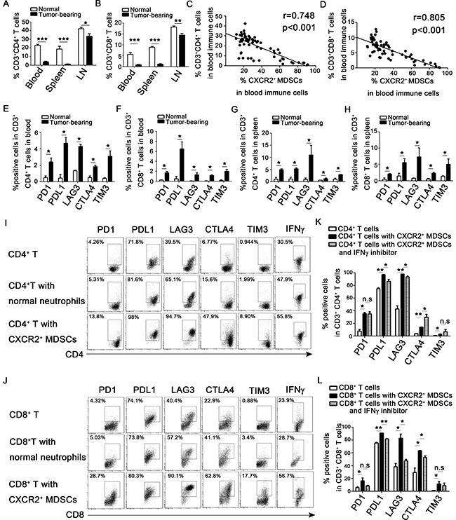 Figure 6: CXCR2+ MDSCs induce activated T cells exhaustion. (A–D) 4T1 tumor-bearing mice were sacrificed on day 0, 7, 14, 21, 28, 35 after subcutaneously injected with 4 × 105 4T1 cells. Single cells of peripheral blood, spleen and axillary lymph nodes (LN) derived from 4T1 tumor-bearing or normal mice were obtained, and analyzed by flow cytometric staining with CD3, CD4, CD8, Ly6G, Ly6C, CD11b, and CXCR2 antibody as described in the Methods. (A) Percentage of CD3+CD4+ T cells in immune cells of peripheral blood, spleen and axillary lymph nodes on day 35 after tumor injection. (B) Percentage of CD3+CD8+ T cells in immune cells of peripheral blood, spleens and axillary lymph nodes on day 35 after tumor inoculation. (C, D) Correlation analysis between the percentage of CD3+CD4+ T cells (C) or CD3+CD8+ T cells (D) and CXCR2+ MDSCs. (E–H) The checkpoint molecular expression on CD3+CD4+ and CD3+CD8+ T cells in peripheral blood and spleen derived from normal or tumor-bearing mice. (I, J) The expression of checkpoint molecular and IFN-γ of CD3+CD4+ and CD3+CD8+ T cells cultured with or without CXCR2− cells from normal mice (T cells: CXCR2−cells 1:1) or CXCR2+ MDSCs from tumor-bearing mice (T cells: CXCR2+MDSCs 1:1). (K, L) The expression of checkpoint molecular of CD3+CD4+ or CD3+CD8+ T cells co-cultured with CXCR2+ MDSCs with or without IFNγ inhibitor. *P < 0.05, **P < 0.01, ***P < 0.001. Each experiment was replicated at least three times.