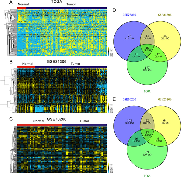 Figure 1: Expression profiles of miRNAs in prostate cancer specimens compared with normal prostate tissues. (A–C) Heatmaps for aberrantly expressed in prostate cancer in publicly available gene expression data TCGA (A), GSE21360 (B) and GSE76260 (C). Samples are in columns and miRNAs are in rows. (D–E) Venn diagrams for miRNAs whose expression are significantly up-regulated (D) and down-regulated (E) in TCGA, GSE21360 and GSE76260.