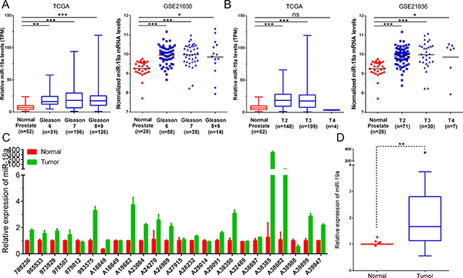 Figure 2: MiR-19a is up-regulated in prostate cancer tissue samples. (A) MiR-19a expression levels of prostate cancer according to biopsy Gleason scores and in TCGA and GSE21036. (B) MiR-19a expression levels of prostate cancer according to preoperative clinical stages in TCGA and GSE21036. (C–D) Quantitative RT-PCR was performed to evaluate the expression levels of miR-19a from 24 prostate cancers specimens compared with their corresponding adjacent prostate tissues. Expression levels of miR-19a were normalized to that of RNU6.