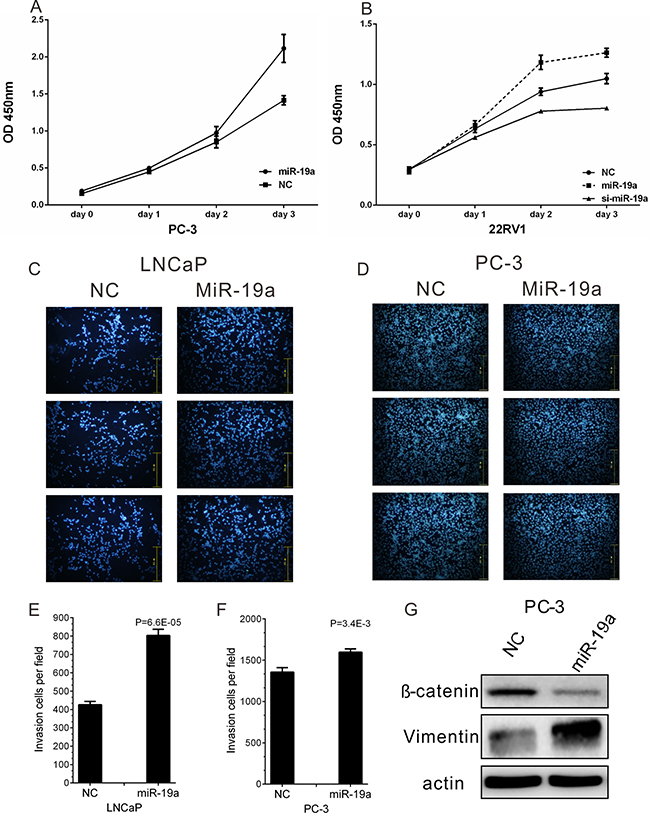 Figure 3: MiR-19a promotes cell proliferation and migration of PCa cells. (A–B) Cell proliferation analysis was performed with CCK-8 assay in PC-3 (A) and 22Rv1 (B) cells. Cells transfected with miR-19a mimics or miR-19a inhibitor were seeded into 96-well plate at 5000 cells/well and examined at different time point. (C–F) Migration of LNCaP (C) and PC-3 (D) cells after miR-19a and NC transfection was counted by transwell assay. The invasion cell number of LNCaP (E) and PC-3 (F) was presented in histogram. (G) Western blot analyses of EMT markers for PC-3 cells after 48 h of miR-19a mimics transfection. Data are presented as the mean ± SD (n = 3). Significance was defined as P < 0.05 (*P < 0.05; **P < 0.01; ***P < 0.001); ns means not significant.