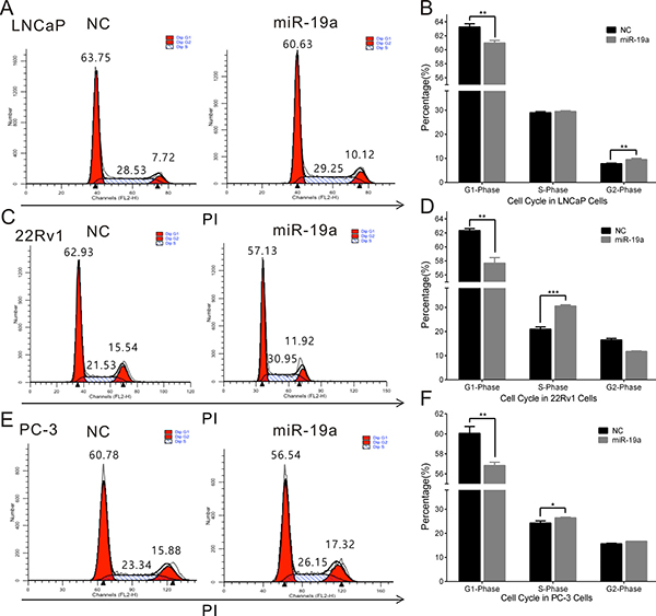 Figure 4: MiR-19a promotes cell cycle in PCa cells. (A–F) Cell cycle assay was performed in LNCaP (A, B), 22Rv1 (C, D) and PC-3 (E, F) cells. Cells were transfected with miR-19a for 48h, stained with PI and evaluated with a FACScalibur flow cytometer. Data are presented as the mean ± SD (n = 3). Significance was defined as P < 0.05 (*P < 0.05; **P < 0.01; ***P < 0.001); ns means not significant.