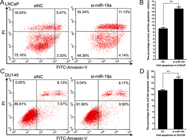 To investigate the apoptotic effects of miR-19a in PCa, LNCaP and DU145 cells transfected with miR-19a inhibitor were stained by Annexin V and PI, and cell apoptosis was analyzed by flow cytometry. Indeed, compared with the inhibitor control, the early and late apoptotic rates were higher in LNCaP and DU145 cells transfected with miR-19a inhibitor (Figure 5A–5D).