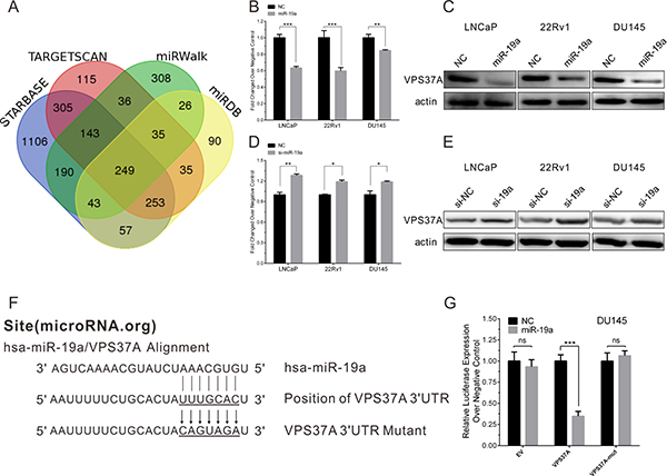 Figure 6: MiR-19a directly targets VPS37A in PCa cells. (A) Venn diagrams for miR-19a targeted genes using four open-access algorithms, including TargetScan, miRanda, miRwalk, and starBase. (B–C) qRT-PCR and western blotting analysis of VPS37A after miR-19a mimics transfection in LNCaP, 22Rv1 and DU145 as indicated. β-actin was used as internal control. (D–E) qRT-PCR and western blotting analysis of VPS37A after miR-19a inhibitor transfection in LNCaP, 22Rv1 and DU145 as indicated. β-actin was used as internal control. (F) Sequence alignment of human miR-19a and 3′-UTR of VPS37A using microRNA.org. The seed sequence of miR-19a (top) matches 3′-UTR of VPS37A (middle). Bottom is the mutation of the 3′-UTR of VPS37A used in luciferase reporter construct. (G) Luciferase assay in DU145 cells. MiR-19a over-expression decreased the luciferase activity of VPS37A, but did not affect that of EV and VPS37A-mut. Data are presented as the mean ± SD (n = 3). Significance was defined as P < 0.05 (*P < 0.05; **P < 0.01; ***P < 0.001); ns means not significant.