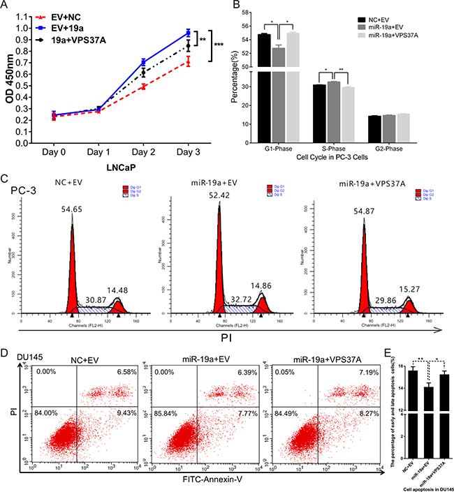 Figure 7: MiR-19a regulates proliferation, cell cycle and apoptosis through VPS37A. (A) Cell proliferation analysis was performed with CCK-8 assay in LNCaP co-transfected with miR-19a and pcDNA3.1(+)-VPS37A. (B–C) Cell cycle assay was performed in PC-3 cells. Cells were co-transfected with miR-19a and pcDNA3.1(+)-VPS37A for 48h. (D–E) Cell apoptosis assay was performed in DU145 cells co-transfected with miR-19a and pcDNA3.1(+)-VPS37A for 48 h with flow cytometer. Data are presented as the mean ± SD (n = 3). Significance was defined as P < 0.05 (*P < 0.05; **P < 0.01; ***P < 0.001); ns means not significant.