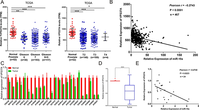 Figure 8: Correlations between the expression levels of miR-19a and VPS37A. (A) MiR-19a expression levels of prostate cancer according to biopsy Gleason scores and preoperative clinical stages in TCGA. (B) Correlation plots of miR-19a and VPS37A by Pearson’s product-moment correlation coefficient in TCGA. (C–D) Quantitative RT-PCR was performed to evaluate the expression levels of VPS37A from 24 prostate cancers specimens compared with their corresponding adjacent prostate tissues. β-actin was used as internal control. (E) Correlation plots of miR-19a and VPS37A by Pearson’s product-moment correlation coefficient in PCa specimens. Data are presented as the mean ± SD (n = 3). Significance was defined as P < 0.05 (*P < 0.05; **P < 0.01; ***P < 0.001); ns means not significant.