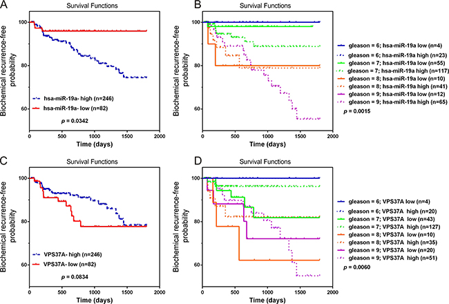 Furthermore, the clinical values of miR-19a and VPS37A were revealed by our study. Public data analysis showed miR-19a was up-regulated and VPS37A was down-regulated in PCa samples. Moreover, up-expression of miR-19a and low-expression of VPS37A were observed in our 24 PCa specimen. Moreover, miR-19a-high and VPS37A-low phenotypes were associated with poor prognosis with biochemical recurrence-free probability. In summary, miR-19a and VPS37A might be potential markers for PCa.