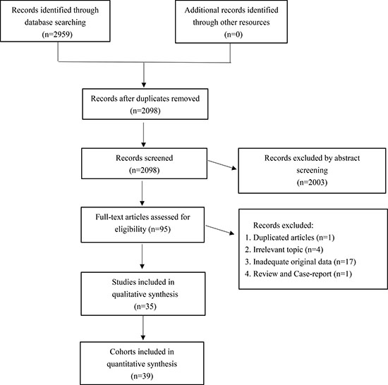 A total of 35 studies were selected from the initially retrieved 2,959 articles, which consisted of 39 retrospective cohorts (Figure 1). The sample size ranged from 30 to 285, with an overall sample size of 3,980 cases. The chief source country of the included investigations is China (n = 13), followed by Japan (n = 4), South Korea (n = 4), and Spain (n = 4); Greece (n = 3); Germany (n = 2) and the United States (n = 2); and France (n = 1), Italy (n = 1), and the UK (n = 1). Breast cancer (n = 6), lung cancer (n = 5), renal cancer (n = 3), and pancreatic cancer (n = 3) were the most frequent cancer types in the included articles. A total of 30 studies reported overall survival, and 14 studies reported disease-free survival. Other detailed baseline features were summarized and recorded in Supplementary Table 1 [6–40].