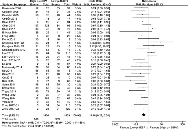 Figure 3: The correlation between p-4EBP1 expression and 5-year overall survival in malignancies.