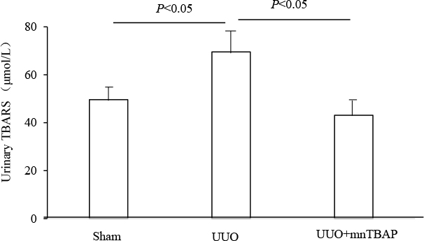 Figure 6: Urinary TBARS levels in UUO mice following MnTBAP treatment. The presented data are means ± SE. N = 6 in each group.