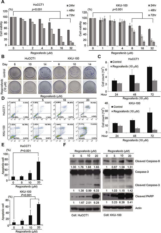 Figure 1: Regorafenib inhibited CCA cell growth and induced tumor cell apoptosis. (A) HuCCT1 and KKU-100 cell lines were cultured with or without regorafenib at gradient concentrations for 24, 48 and 72 hrs. Cell viability was evaluated by MTT assay. Data represents the mean ± standard deviation of three independent experiments. (B) Colony formation assay in HuCCT1 and KKU-100 cells at 6, 10 and 14 days following treatment with or without 10 μM regorafenib. (C) Cell count assay in HuCCT1 and KKU-100 cells at 24, 48 and 72 hr by microscopy. (D) Quantitation of the propidium iodide (PI) percentage of HuccT1 and KKU-100 cells cultured with regorafenib at gradient concentration for 72 hrs through flow cytometry. (E) HuCCT1 and KKU-100 cells were treated with or without regorafenib at the indicated concentrations, 0, 5, 10 and 20 μM for 48 hrs. Apoptotic cells were measured using the TACS Annexin V-FITC apoptosis detection kit and are represented as a percentage of total events. (F) Western blot analysis of cleaved PARP, caspase 9, and caspase 3 in HuCCT1 and KKU-100 cells after treatment with or without regorafenib at the indicated concentrations 0, 5, 10 and 20 μM for 48 hrs. β-actin was used as an internal control for protein loading.