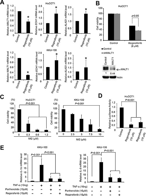 Figure 2: Regorafenib inhibited MALT1 expression and NF-κB pathway. (A) HuCCT1 and KKU100 cells were cultured with or without regorafenib (10 μM) for 48 h and lysed with TRI reagent. Total RNA was harvested for reverse transcription. The mRNA levels of ECH1, MALT1, ALAS1, and GAPDH were then analyzed by quantitative PCR. All data were normalized to GAPDH (internal control). (B) Upper panels shows drug sensitivities of the LacZ- and MALT1-knockdown HuCCT1 cells were analyzed by MTT-based viability assays 72 h after treatment 8 μM regorafenib. Lower panel shows Immunoblot analyse of MALT1. β-actin is the internal protein loading control. (C) HuCCT1 and KKU100 cell lines were cultured with or without MI-2 at the indicated concentrations for 72 h. Cell viability was evaluated by MTT assay. (D) HuCCT1 cells were cultured with or without 10 μM parthenolide, and 10 μM regorafenib for 24 h; NF-κB activity was evaluated with transient luciferase assays. (E) KKU100 cells were cultured with or without 10 μM TNF-a, 10 μM TNF-a plus parthenolide, and 10 μM TNF-a plus 10 μM regorafenib for 16 h. The NF-κB target genes IL1a and IL8 were measured by RT-qPCR. Data represent the mean ± standard deviation of three independent experiments (*P < 0.05 analyzed by student’s t-test.)
