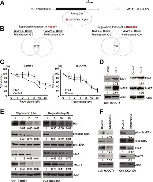 Figure 3: Regorafenib inhibited MALT1 through the RAF/ERK/Elk-1 pathway. (A) The 26 putative MALT1 promoter regions from roughly –1500 to +660 base pairs relative to the transcription start site were analyzed by PROMO 3.0 software. (B) The gene signatures of HuCCT1 and KKU-100 cells cultured without or with low doses (1 μM) or high doses (10 μM) of regorafenib for 6 h were analyzed by Ingenuity Pathway Analysis (IPA). (C) Drug sensitivities of the LacZ- and Elk-1 or ETS1-overexpressing cells were analyzed by MTT-based viability assays 72 h after treatment with the indicated concentrations of regorafenib. (D) Immunoblot analyses of Elk-1, ETS1, MALT1, with tubulin loading controls. (E) Immunoblot analyses of RAF-1, p-ERK, ERK, Elk-1, and MALT1, with or without regorafenib dose-dependent treatment in HuCCT1 and KKU-100 cells. β-actin is the internal protein loading control. (F) Immunoblot analyses of p-ERK, ERK, Elk-1, and MALT1 with or without SCH722984 treatment in HuCCT1 and KKU-100 cells. β-actin is the internal protein loading control (*P < 0.05 analyzed by student’s t-test.)