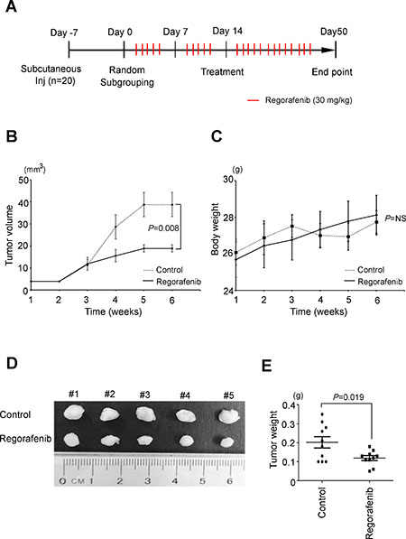 Figure 4: Regorafenib suppresses cholangiocarcinoma tumorigenicity in vivo. (A) The flow chart of xenograft animal model treated with or without regorafenib. (regorafenib dose 30 mg/kg, 5 times per week, oral bleeding). (B) Overview of the solid tumor growth between regorafenib (30 mg/kg, dotted line) treatments compared with the control group (PBS, solid line) in vivo. (P = 8 × 103, n = 5). (C) The body weights between regorafenib and control groups were similar. (D) Representative photographs of tumor size (n = 5 per treatment group). (E) Significantly lower tumor weight was found in the regorafenib group compared to the control group (P = 0.019). The statistical significances in control and regorafenib groups were analyzed by paired t-test.