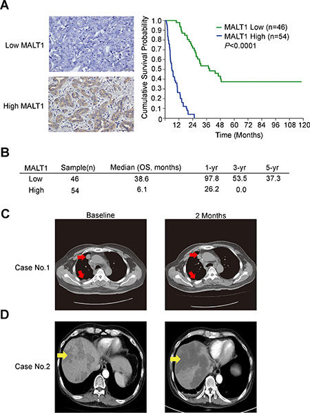 Figure 5: MALT1 expression correlated with worse survival in patients with resectable CCA. (A) Upper-left and lower-left panels show representative low and high MALT1 immunohistochemical staining intensities respectively. Scale bar = 50 μm. Panel on the right shows the Kaplan–Meier plot of overall survival (OS) in patients with resectable MF-CCA tumors, based on their MALT1 expression levels. (B) The median OS, 1-year, 3-year, and 5-year survival rates in patients with resectable MF-CCA tumors, based on their MALT1 expression levels. (C) A 58-year-old man with metastatic CCA with a partial remission after regorafenib treatment. Before the start of treatment, computed tomographic (CT) images without intravenous contrast demonstrated pleural seeding and lymph node metastasis (white arrows). Follow-up CT images obtained 2 months after the start of therapy demonstrated regression of these lesions (white arrows). (D) A 50-year-old man with metastatic CCA with a stable disease after regorafenib treatment. Before the start of treatment, computed tomographic (CT) images with intravenous contrast demonstrated multiple liver metastases (yellow arrows). Follow-up CT images obtained 2 months after the start of therapy demonstrated marked tumor necrosis of these lesions (yellow arrows).