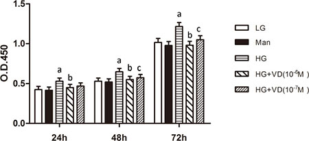 Figure 1: 1,25(OH)2 D3 inhibits RMCs proliferation induced by high glucose. The proliferative activity of RMCs was detected using a cell counting kit-8 assay. ap < 0.05, HG vs. LG (n = 3); bp < 0.05, HG + VD (10−6 M) vs. HG (n = 3); cp < 0.05, HG + VD (10−7) vs. HG (n = 3). LG: 5.5 mM glucose; Man: 5.5 mM glucose + 24.5 mM mannitol; HG: 30 mM glucose.