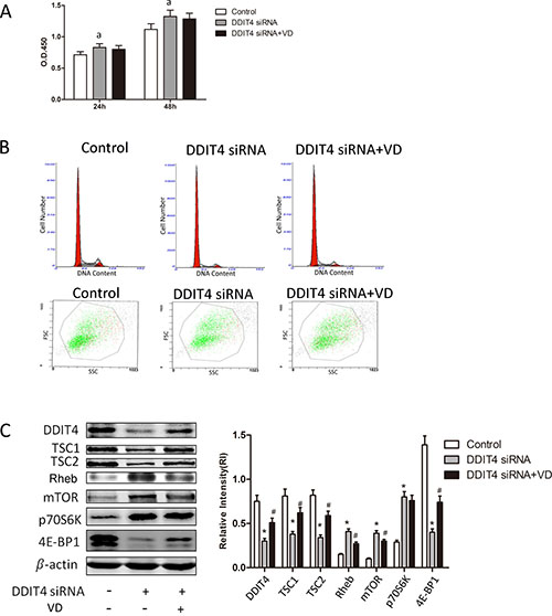 Figure 5: siRNA knockdown of the DDIT4 antiproliferative responses to 1,25(OH)2 D3. RMCs were transfected with negative control siRNA orDDIT4-specific siRNA in the presence or absence of 1,25(OH) 2 D3 . (A) The proliferative activity of the transfected RMCs was detected using the cell counting kit-8 assay. ap < 0.05, DDIT4 siRNA vs. control (n = 3). (B) Cell-cycle distribution and size of the transfected RMCs analyzed using flow cytometry. (C) DDIT4, TSC1/TSC2, Rheb, mTOR, 4E-BP1 and p70S6K protein expression levels were detected by Western blot. *p < 0.05, DDIT4 siRNA vs. control; #p < 0.05, DDIT4 siRNA+VD vs. DDIT4 siRNA (n = 3).
