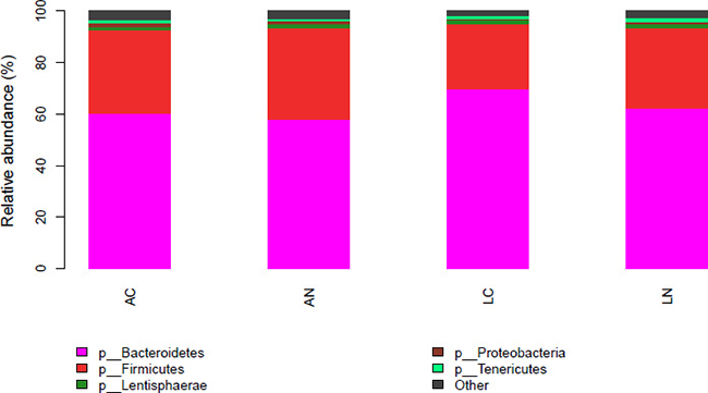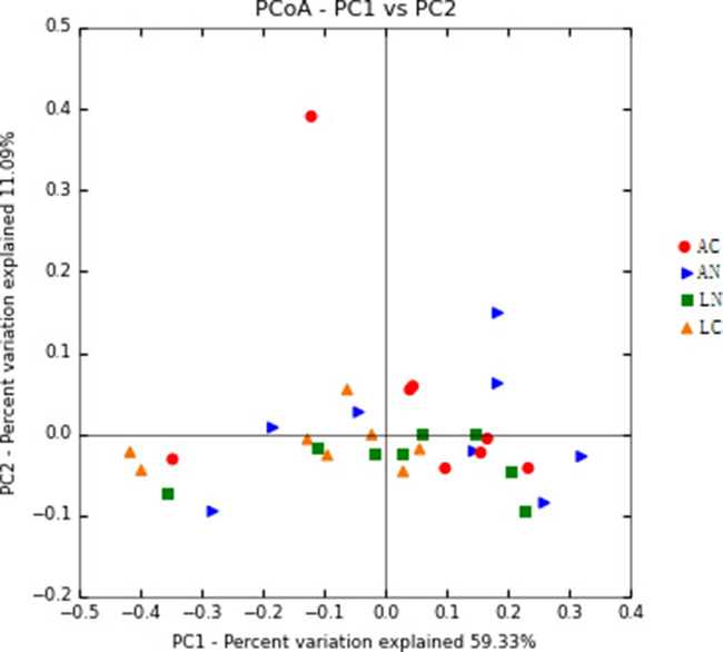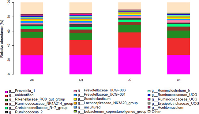 1Dietary treatments: LN = Leymus as the only roughage with No calcium salts of fatty acid, LC = Leymus as the only roughage with Calcium salts of fatty acids, AN = Alfalfa replace 50% leymus with No calcium salts of fatty acids, AC = Alfalfa replace 50% leymus with Calcium salts of fatty acids.