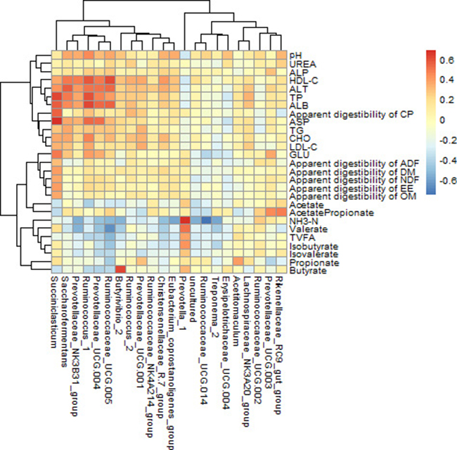 Correlation analysis was counted of between rumen bacteria and rumen fermentation characteristics, nutrients apparent digestibility, serum biochemical parameters by spearman rank correlation test using R software. Significance was declared at P < 0.05.