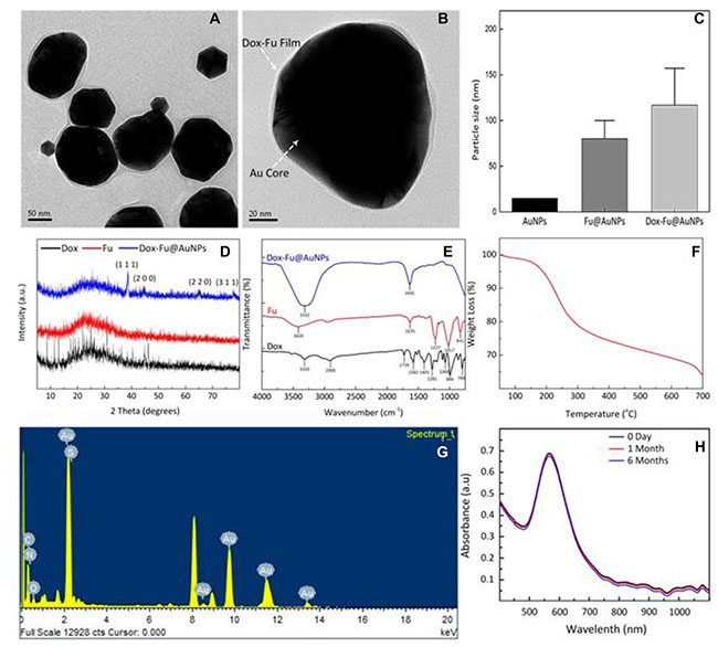 Figure 1: Characterization of synthesized Dox-Fu@AuNPs. TEM images of (A) Dox-Fu@AuNPs and (B) Dox-Fu@AuNPs surrounded with grey shell representing Fu-coated Dox, (C) comparison of AuNPs [31], Fu@AuNPs [20], and Dox-Fu@AuNPs estimated by DLS, (D) and (E) XRD patterns and FT-IR spectra of Dox, Fu, and Dox-Fu@AuNPs, respectively, (F) TGA curve of Dox-Fu@AuNPs, (G) EDS analysis of Dox-Fu@AuNPs, and (H) absorption spectra of Dox-Fu@AuNPs as function of wavelength at various times (0 day, 1 day, and 6 months).