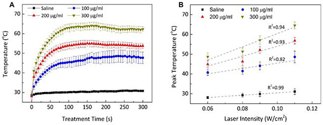 Figure 2: Photothermal effects of Dox-Fu@AuNPs. (A) Temporal development of Dox-Fu@AuNPs in 1 ml of saline was monitored during laser exposure at 0.11 W/cm2 for 5 min. (B) The peak temperatures from saline and Dox-Fu@AuNPs in aqueous solution at various concentrations (0 from saline, 100, 200, and 300 μg/ ml) after 5-min laser irradiation was compared as a function of laser intensity.
