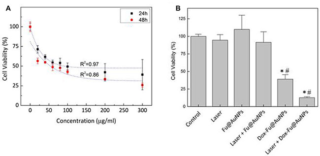 Figure 3: Photothermal and cytotoxicity effects against VX2 cells with Dox-Fu@AuNPs. (A) The cell viability of Dox-Fu@AuNPs in VX2 at various concentrations (0, 20, 40, 60, 80, 100, 200, and 300 μg/ml) with different incubation times (24 and 48 h) was measured by using MTT assay. (B) VX2 cell viability under various treatment conditions (control, laser, Fu@AuNPs, Dox-Fu@AuNPs, Fu@AuNPs-assisted laser irradiation, and 200-μg/ml Dox-Fu@AuNPs-assisted laser irradiation for 2 min) was analyzed by using MTT assay (*and #: p < 0.05 compared with control and laser group, respectively).